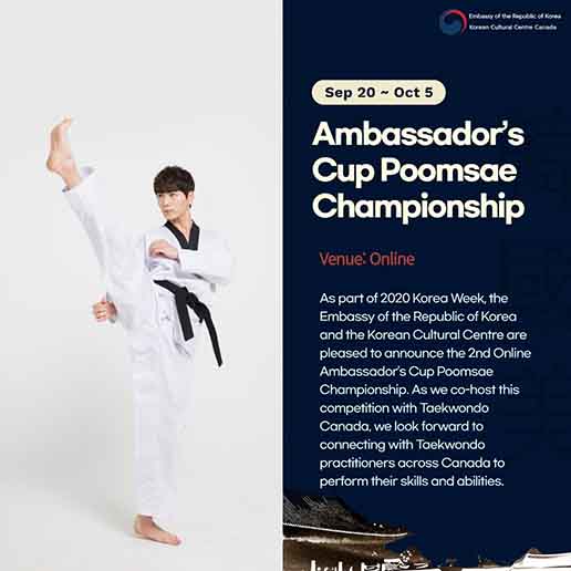 주캐나다 한국대사관(대사 장경룡)과 한국문화원(이하 문화원, 원장이성은)은 캐나다 태권도 협회와 함께 2021 한국주간(2021.9.20~10.13) 기간 동안 <제2회 캐나다 대사배 온라인 태권도 품새대회> 를 개최한다. 이번 대회는 지난해에 이어 현지 코로나 19 상황에 따라 전면 온라인으로 개최된다. 온라인으로 개최되는 만큼, 시간과 장소의 구애 없이 태권도 수련생들이 그동안의 갈고 닦은 기량을 영상으로 제출하면 해당 영상을 바탕으로 캐나다 태권도 공인 심판들의 심사 후 입상자가 결정되는 방식이다.