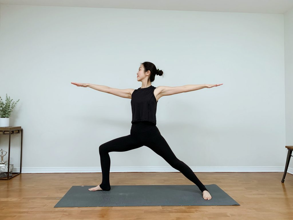 오른 다리를 먼저 앞으로 보내고 왼다리를 뒤로 보내 전사2 자세를 만들어주세요. (영상참조)
