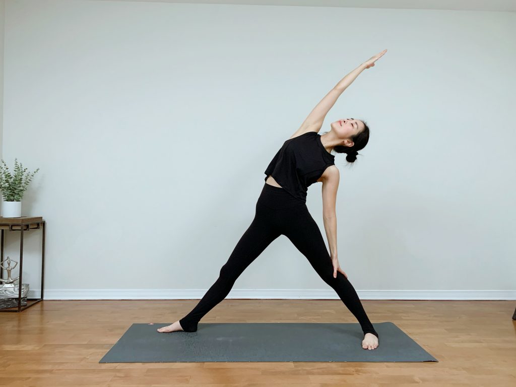 구부린 오른 다리를 펴서 천천히 오른 손을 하늘위로 뻗어줍니다. 복부를 살짝 끌어당긴 상태에서 몸의 측면을 시원하게 스트레칭해주세요.
