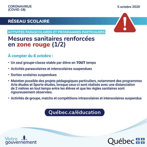 10월 8일부터 10월 28일까지, 이 일련의 전면적인 규제들은 퀘벡 고등학교, CEGEP, 그리고 대학들의 운영 방식을 바꿀 것이며, 의무적인 마스크 규칙의 변경 및 특별교육 활동 제한까지, 적색 지역 해체 전까지의 학생 및 학부모들이 알아야 할 것은 다음과 같다.