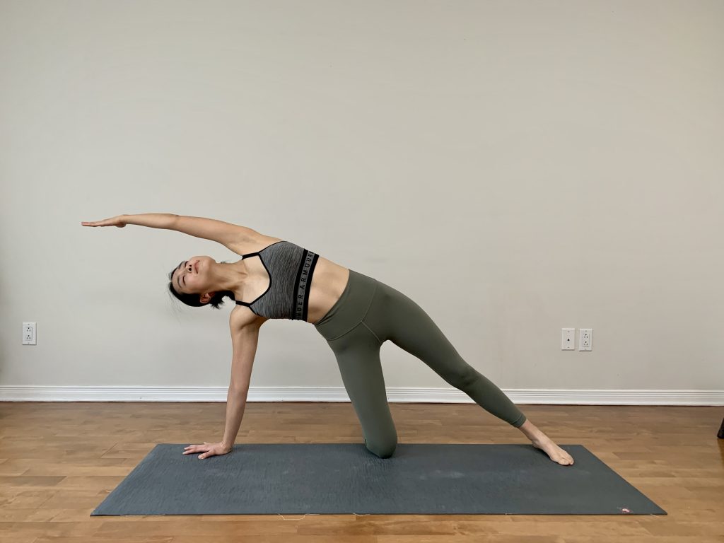 두번째 자세에서 바로 왼손을 천정으로 보내고 코어의 힘으로 왼발을 매트에서 떼어 중심을 잡아봅니다.
