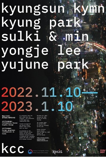 해외문화홍보원과 주캐나다한국대사관, 그리고 주캐나다한국문화원(원장 이성은)은 왕립캐나다예술아카데미 (RCA, Royal Canadian Academy of Arts)와 함께 <art+language: 한국현대그래픽디자인>을 문화원 전시실에서 개최한다. 올해 초 문화원은 2023년 한국-캐나다 수교 60주년을 앞두고 양국 우호관계 60년을 축하하는 큐레이터들의 전시기획안을 공모하였으며 이번 전시는 선정된 4작품중 두번째 작품이다. 전시회는 2022년 11월 10일(목) 부터 2023년 1월 10일(화)까지 진행된다.