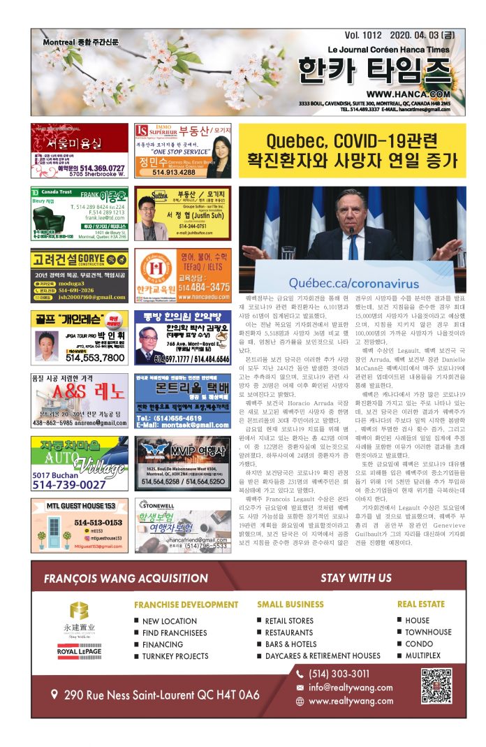 3333 Boul Cavendish Suite 300, Montreal, Quebec, H4B 2M5, Canada | TEL: 514-489-3337 | e-mail: hancatimes@gmail.com | 홈페이지에 게시된 모든 게시글은 법에 의해 보호받으며 저작권은 저자와 한카에 있습니다.