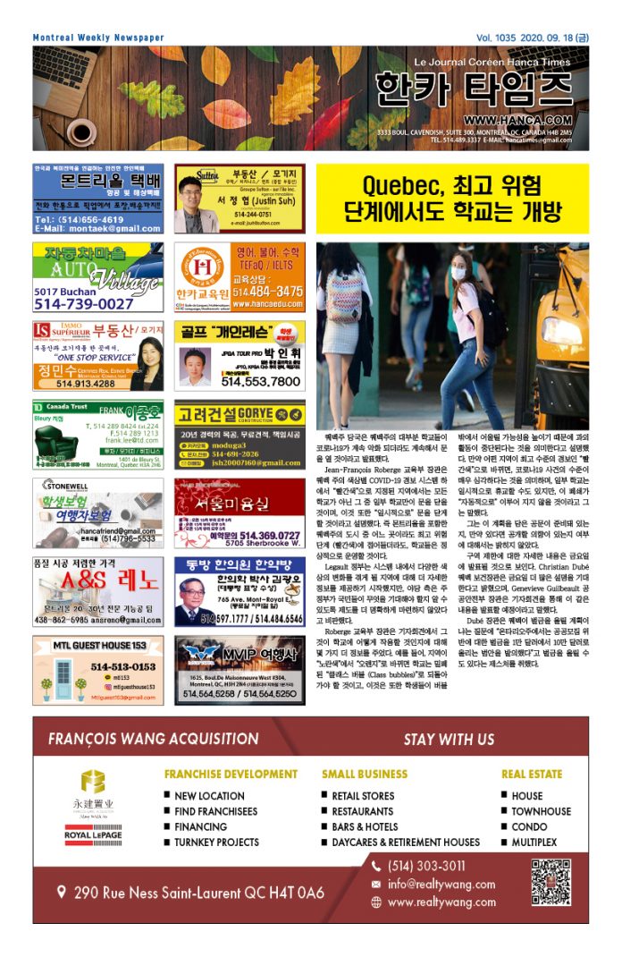 3333 Boul Cavendish Suite 300, Montreal, Quebec, H4B 2M5, Canada | TEL: 514-489-3337 | e-mail: hancatimes@gmail.com | 홈페이지에 게시된 모든 게시글은 법에 의해 보호받으며 저작권은 저자와 한카에 있습니다.