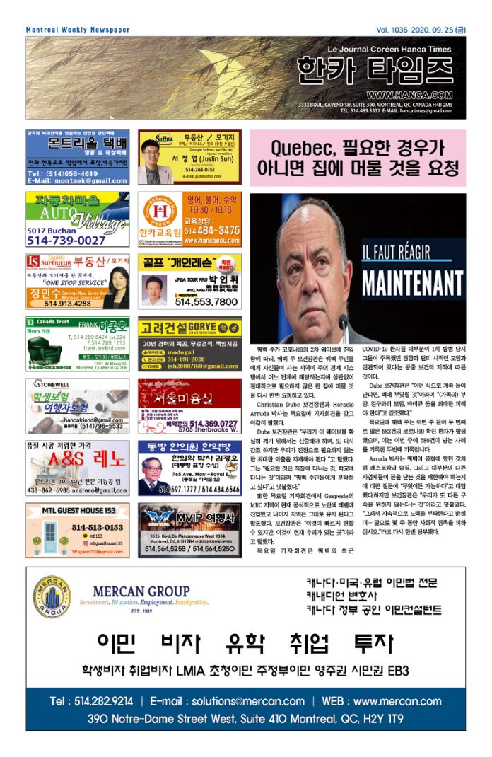 3333 Boul Cavendish Suite 300, Montreal, Quebec, H4B 2M5, Canada | TEL: 514-489-3337 | e-mail: hancatimes@gmail.com | 홈페이지에 게시된 모든 게시글은 법에 의해 보호받으며 저작권은 저자와 한카에 있습니다.