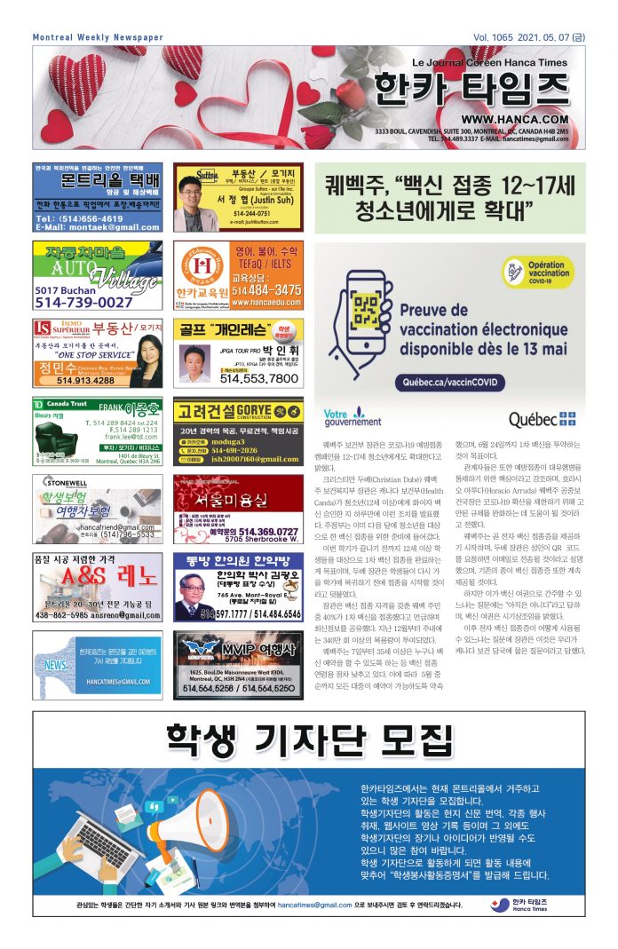 3333 Boul Cavendish Suite 300, Montreal, Quebec, H4B 2M5, Canada | TEL: 514-489-3337 | e-mail: hancatimes@gmail.com | 홈페이지에 게시된 모든 게시글은 법에 의해 보호받으며 저작권은 저자와 한카에 있습니다.