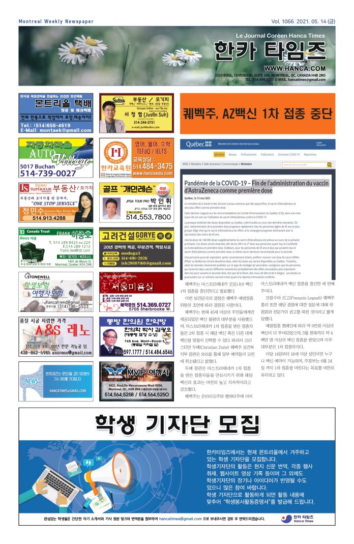 3333 Boul Cavendish Suite 300, Montreal, Quebec, H4B 2M5, Canada | TEL: 514-489-3337 | e-mail: hancatimes@gmail.com | 홈페이지에 게시된 모든 게시글은 법에 의해 보호받으며 저작권은 저자와 한카에 있습니다.