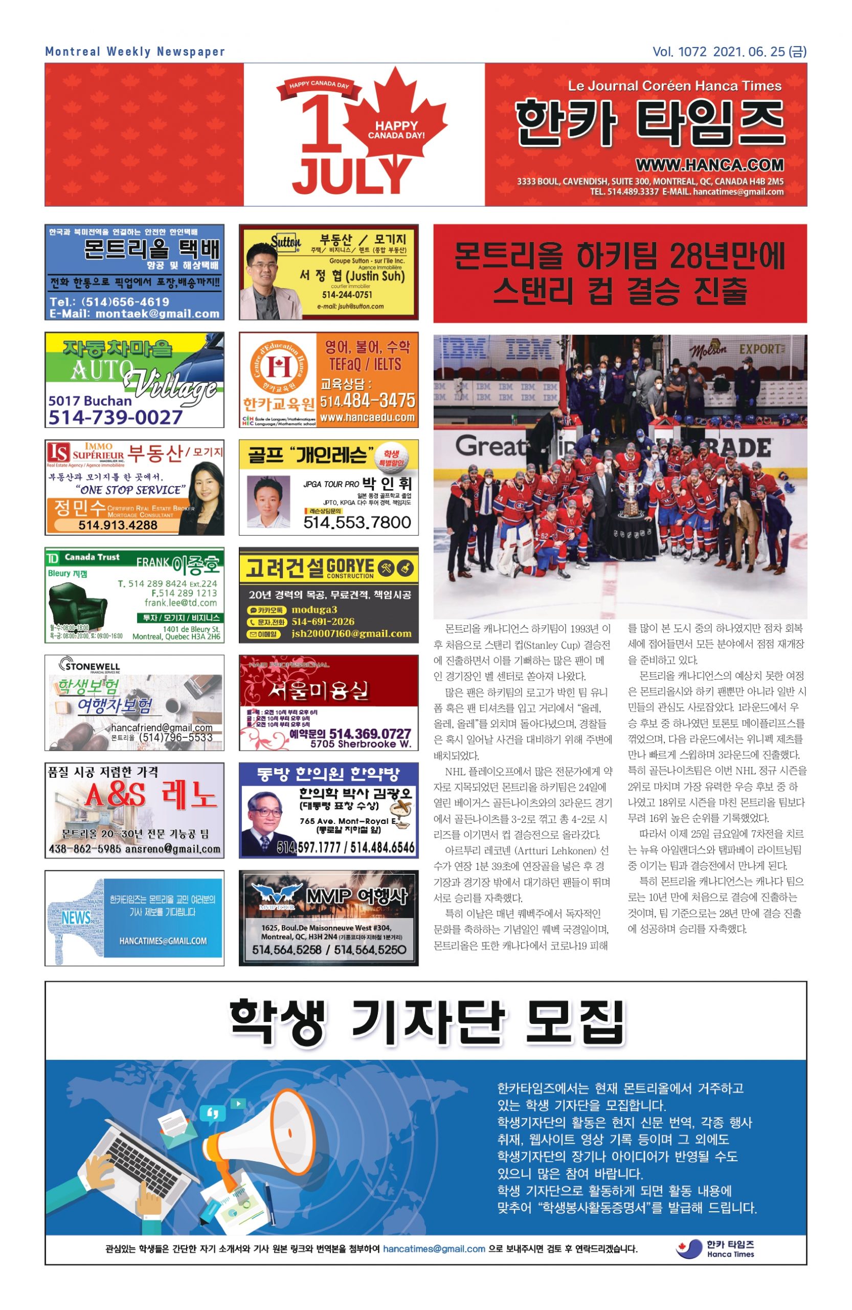 3333 Boul Cavendish Suite 300, Montreal, Quebec, H4B 2M5, Canada | TEL: 514-489-3337 | e-mail: hancatimes@gmail.com | 홈페이지에 게시된 모든 게시글은 법에 의해 보호받으며 저작권은 저자와 한카에 있습니다.
