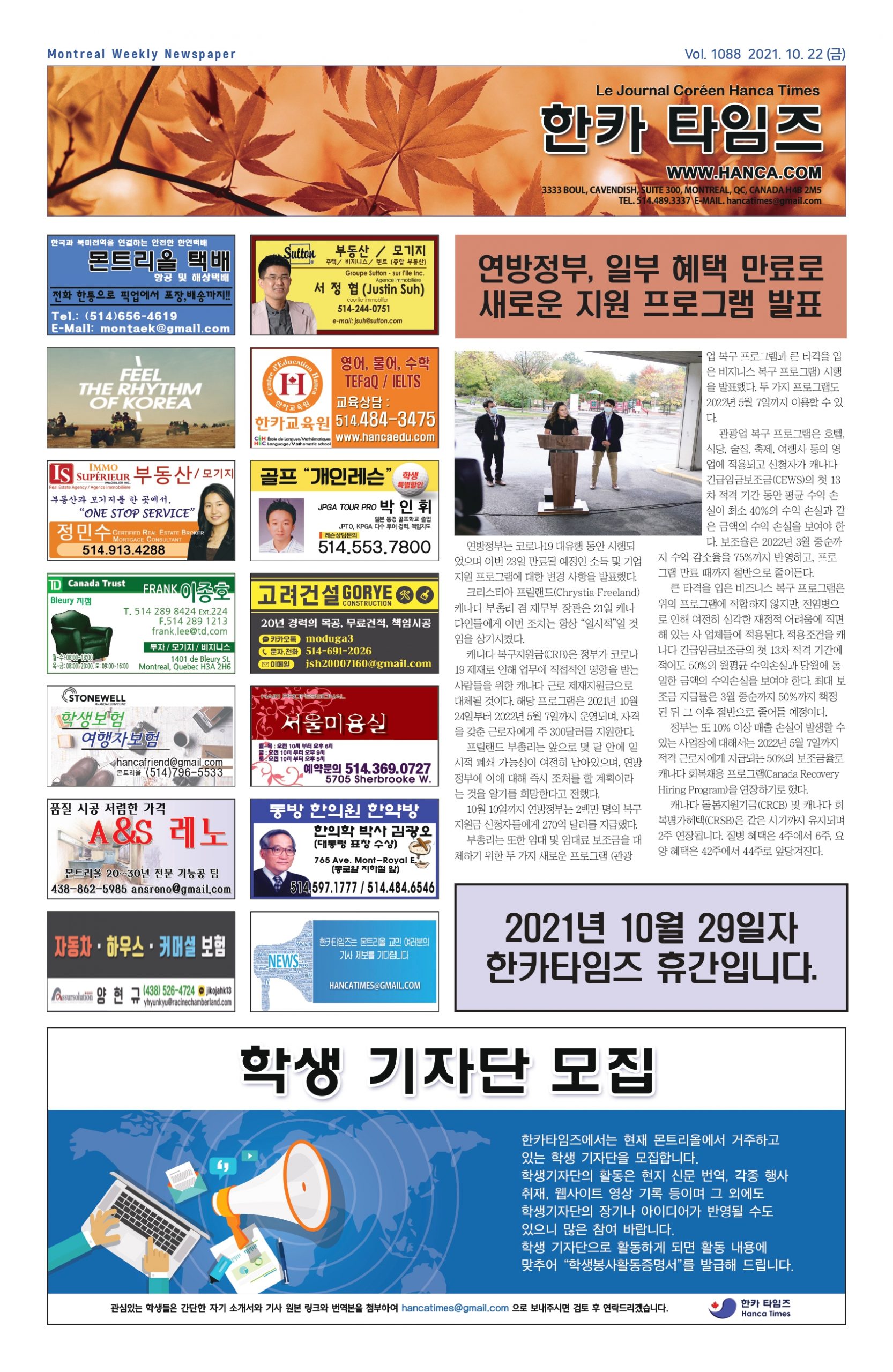 3333 Boul Cavendish Suite 300, Montreal, Quebec, H4B 2M5, Canada | TEL: 514-489-3337 | e-mail: hancatimes@gmail.com | 홈페이지에 게시된 모든 게시글은 법에 의해 보호받으며 저작권은 저자와 한카에 있습니다.