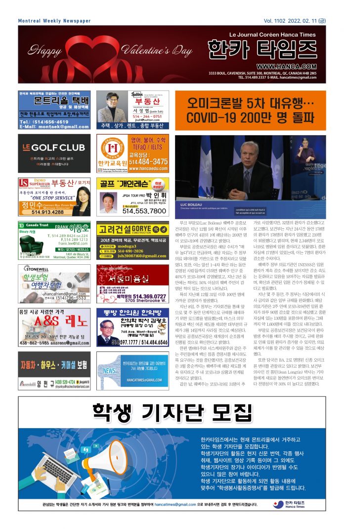 3333 Boul Cavendish Suite 300, Montreal, Quebec, H4B 2M5, Canada | TEL: 514-489-3337 | e-mail: hancatimes@gmail.com | 홈페이지에 게시된 모든 게시글은 법에 의해 보호받으며 저작권은 저자와 한카에 있습니다.